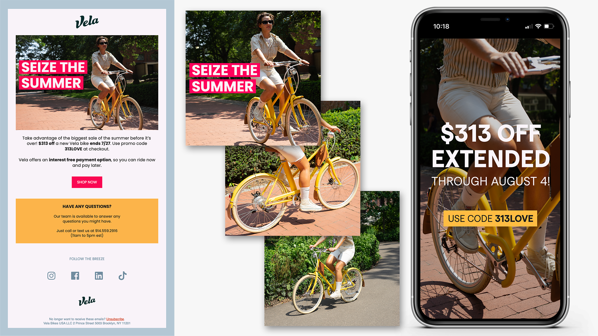 In 2023 I took on the contract position of Marketing Art Director at Vela Bikes, a Brazilian e-bike company with offices in Brooklyn, New York and Detroit, Michigan. I designed key art for advertising campaigns, designed and scheduled email newletters and developed marketing and content strategy to drive e-commerce business.